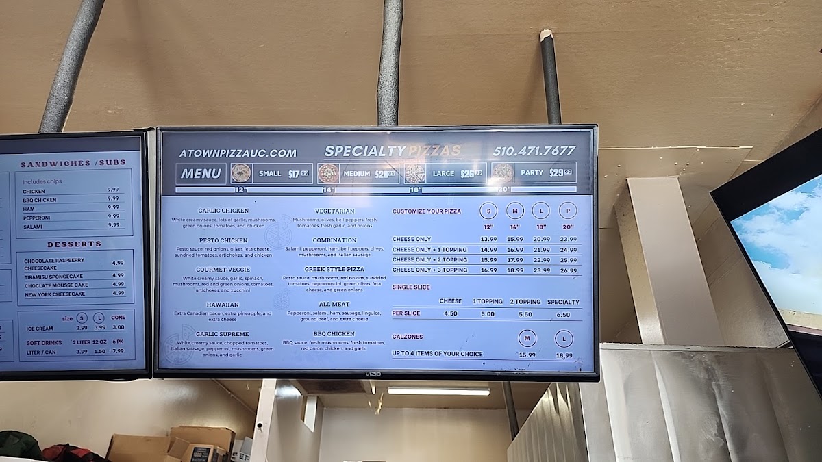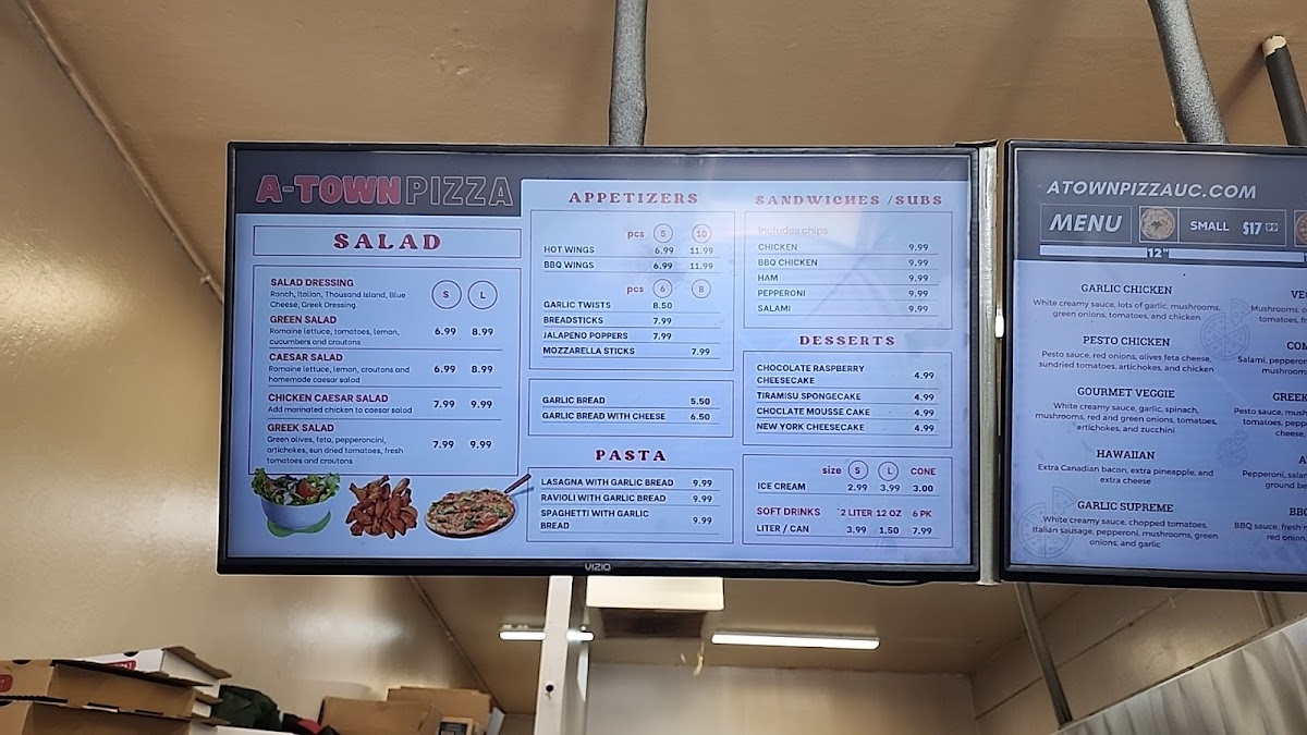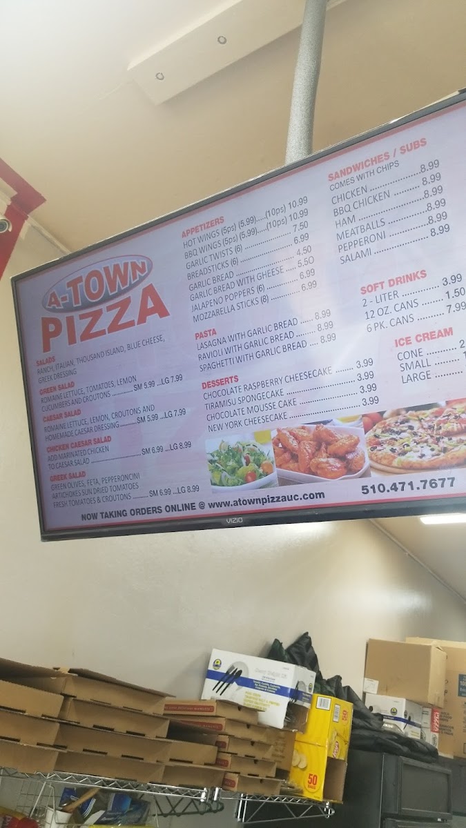 A-Town Pizza in Union City offers a diverse menu with options for every craving. The appetizers include crowd-pleasers like Mozzarella Sticks (8 Pcs), Jalapeño Poppers (6 Pcs), and BBQ Wings (10 Pcs), alongside Garlic Bread With Cheese and Bread Sticks (6 Pcs). For those craving a hearty meal, their Calzones come in two sizes: Large Calzone and Medium Calzone. Pizza lovers will find plenty of choices, from the simple Cheese Pizza to customizable options with up to three toppings, including choices like Cheese Pizza With One Topping or Cheese Pizza With Two Toppings. For a unique twist, try one of their A-Town Specialty Pizzas, such as BBQ Chicken Pizza, Hawaiian Pizza, or the Greek Style Pizza. Sandwiches are another highlight, with options like the BBQ Sandwich, Chicken Sandwich, and Pepperoni Sandwich. For dessert, sweet indulgences like Chocolate Raspberry Cheesecake, Tiramisu Cake, and Chocolate Mousse Cake offer a satisfying finish. The pasta selection includes comforting dishes like Meat Sauce Lasagna With Garlic Bread, Spaghetti With Garlic Bread, and Ravioli With Garlic Bread. Salads like the Chicken Caesar Salad and Greek Salad provide a fresh, lighter option. Pair your meal with a refreshing drink, from Soft Drinks to a 2 Liter Soft Drink. A-Town Pizza delivers a wide range of flavorful dishes that cater to all tastes, making it a great spot for any occasion.